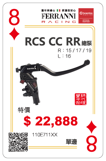 這款全新的RCS corsa corta RR離合器主缸專為廣受歡迎的高性能摩托車而開發,擁有16mm的浮動活塞直徑,以改善對高功率引擎的操作感和使用力道。